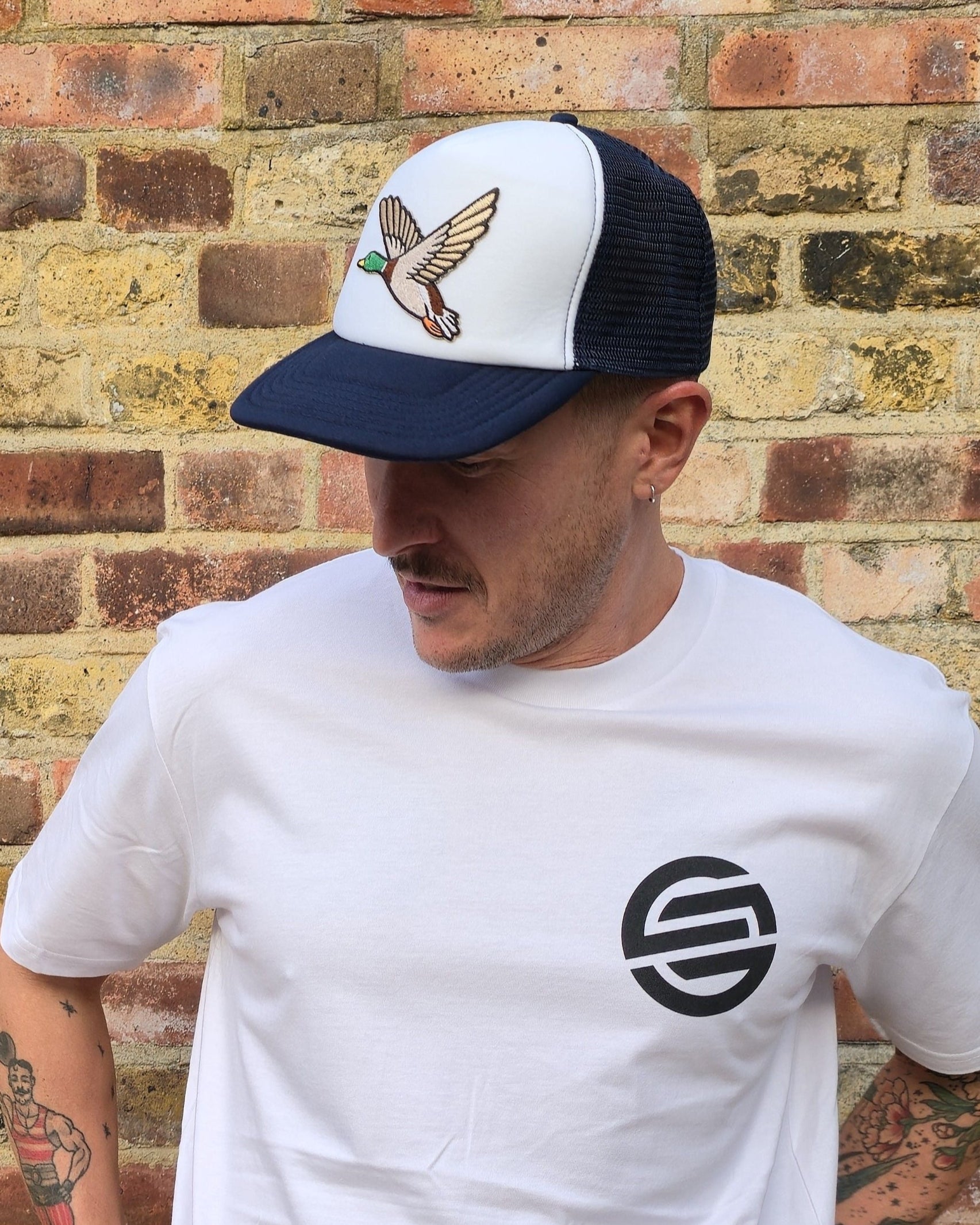 Navy and White Trucker Cap with Embroidered Mallard badge, popper adjustment at back. One Size